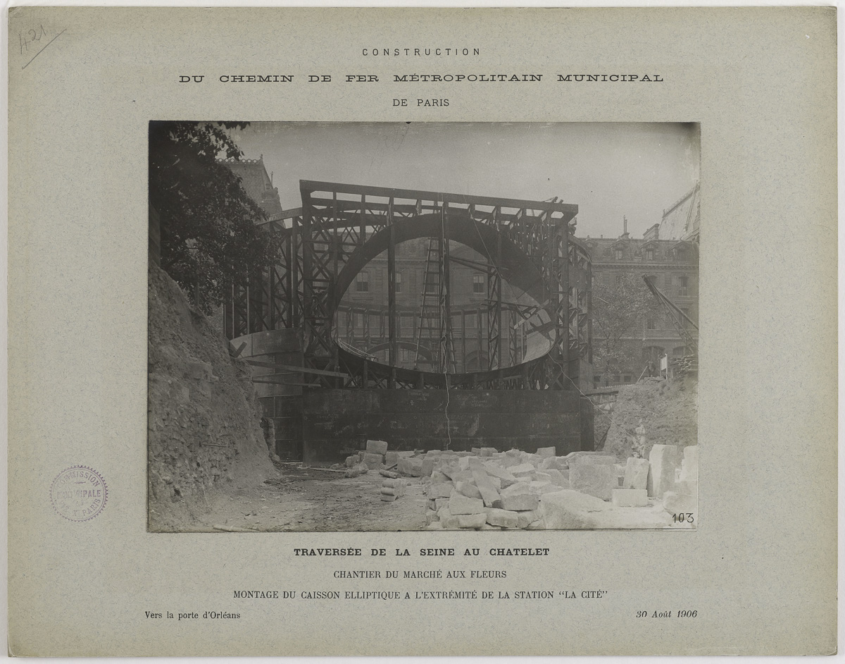 Fonçage du caisson Elliptique à la fin de la station Cité du métro le 18 janvier 1907.