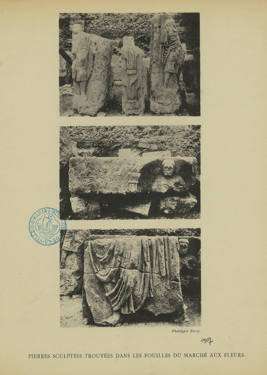 Pierres sculptées trouvées dans les fouilles du marché aux fleurs.