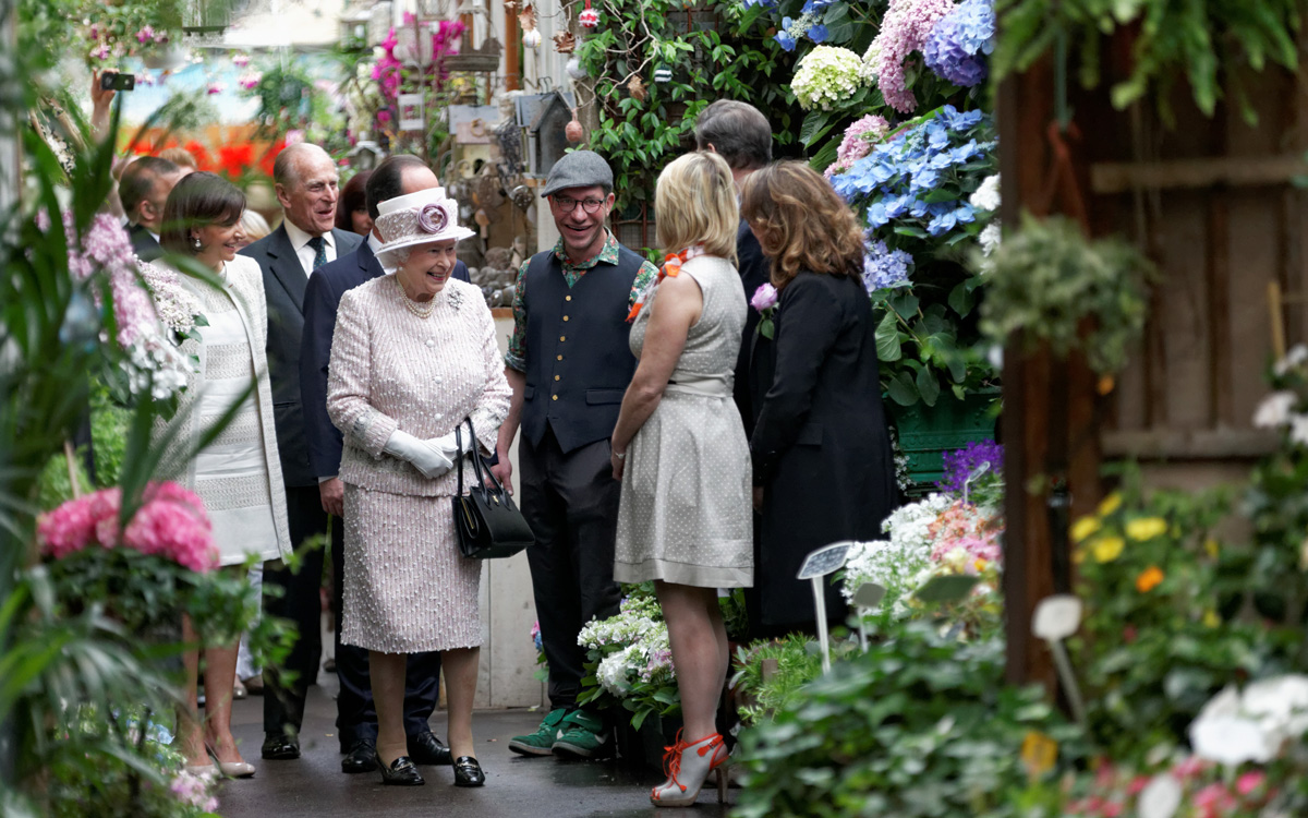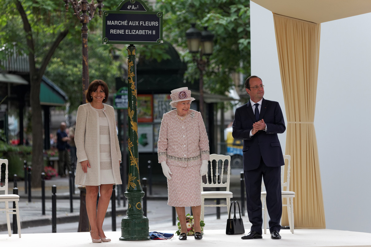 Le 7 juin 2014, la reine d'Angleterre Elisabeth II visite le marché aux fleurs en présence d'Anne Hidalgo et François Hollande