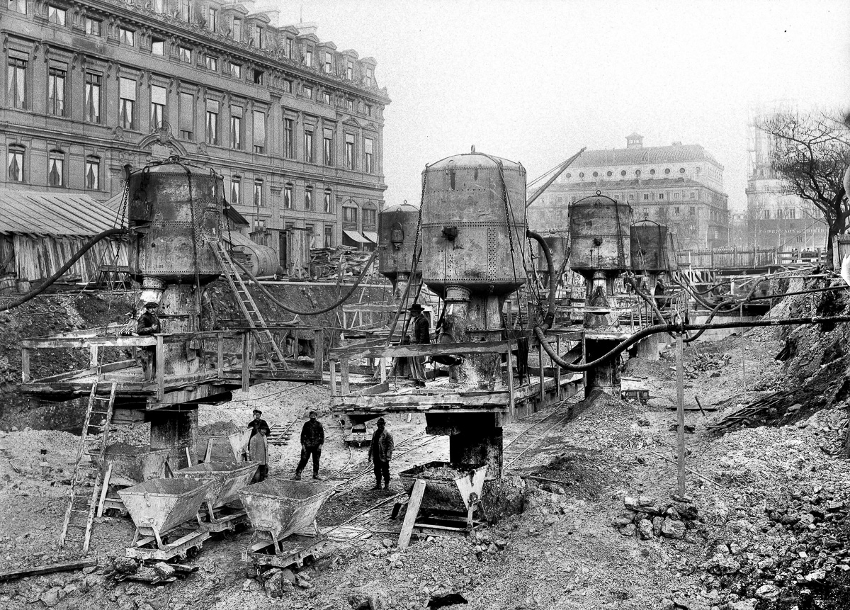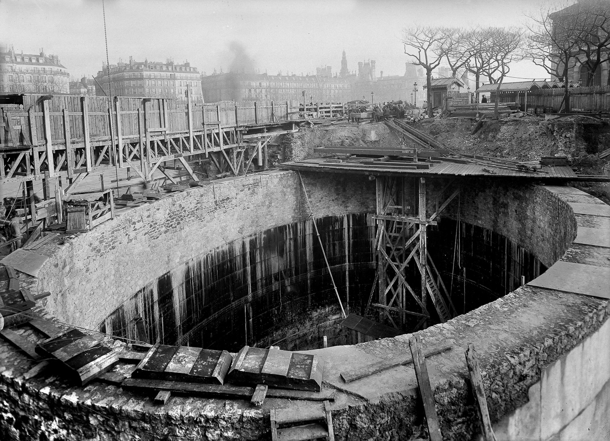 Creusement de la station Cité lors de la construction du métro en 1907.