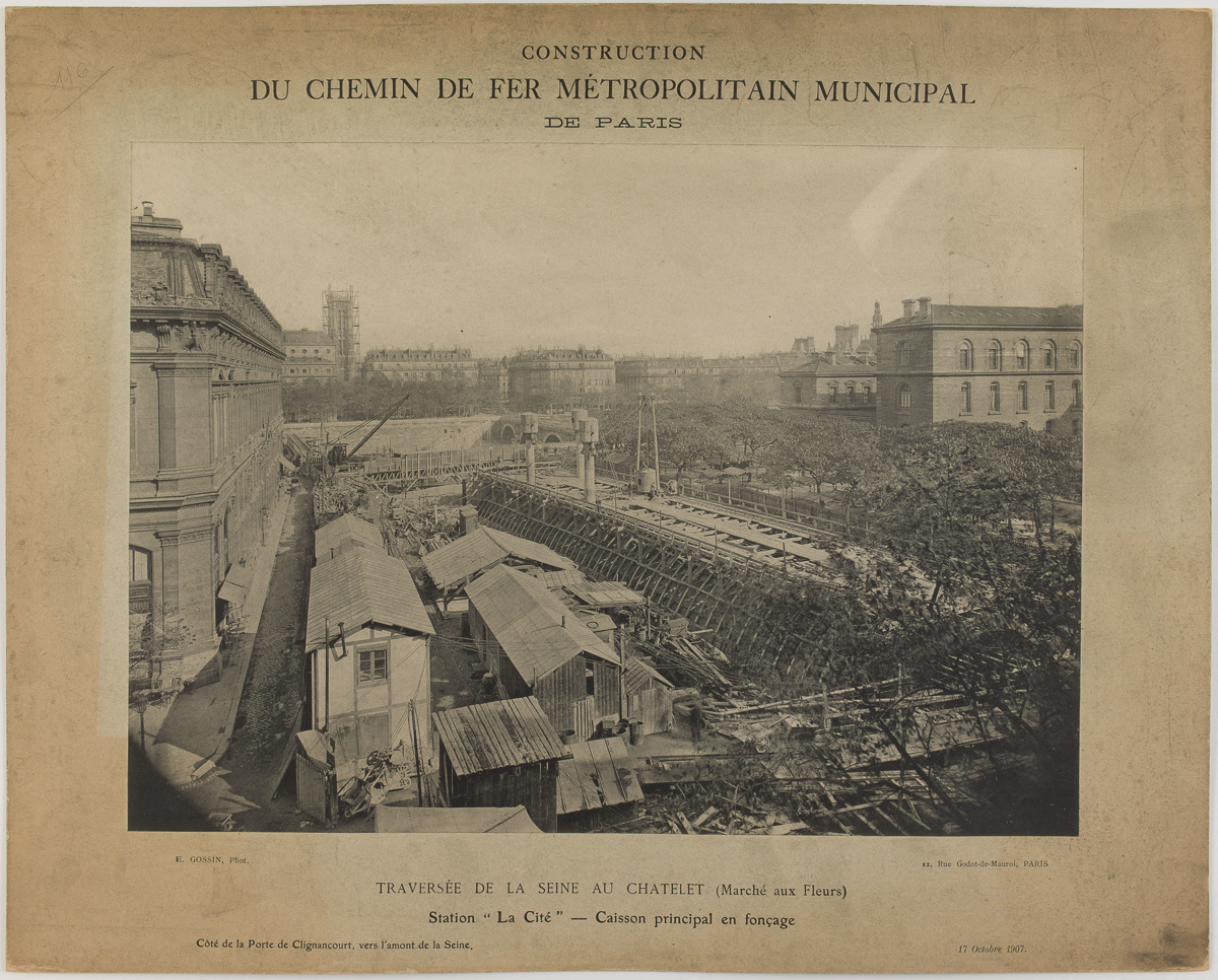 Construction de la station Cité du métro à l'emplacement du marché aux fleurs.