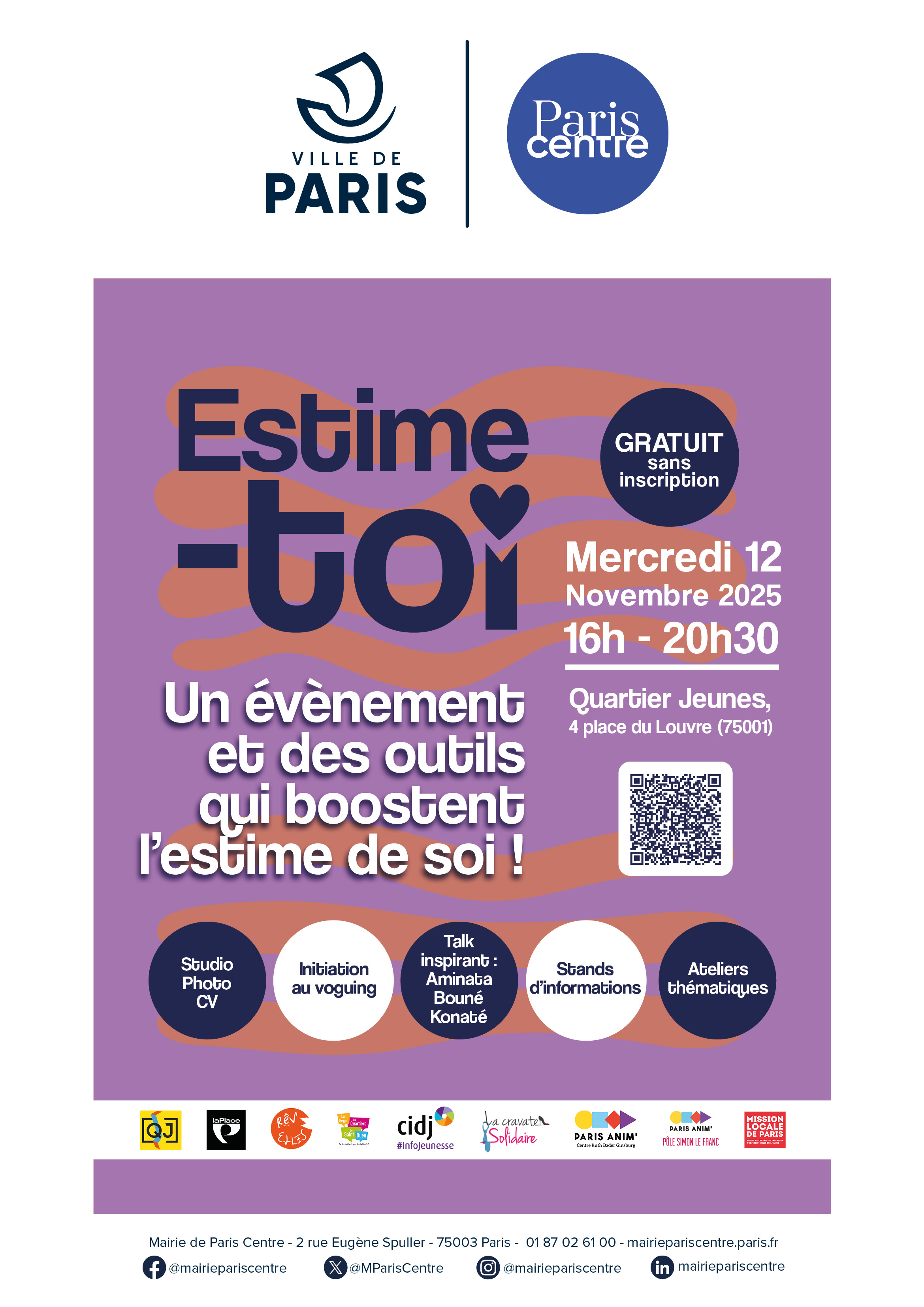 Fort du succès de la première édition en 2024, la Mairie Paris Centre et des partenaires jeunesse du territoire organisent une deuxième édition du Forum « Estime toi ! » à destination des jeunes de 16 à 30 ans, le 22 novembre 2025 de 16h à 20h30 à Quartier Jeunes. L’objectif est d’offrir aux jeunes les outils nécessaires pour bien s’orienter, gagner en confiance et s’affirmer dans le monde du travail et dans leur vie personnelle.