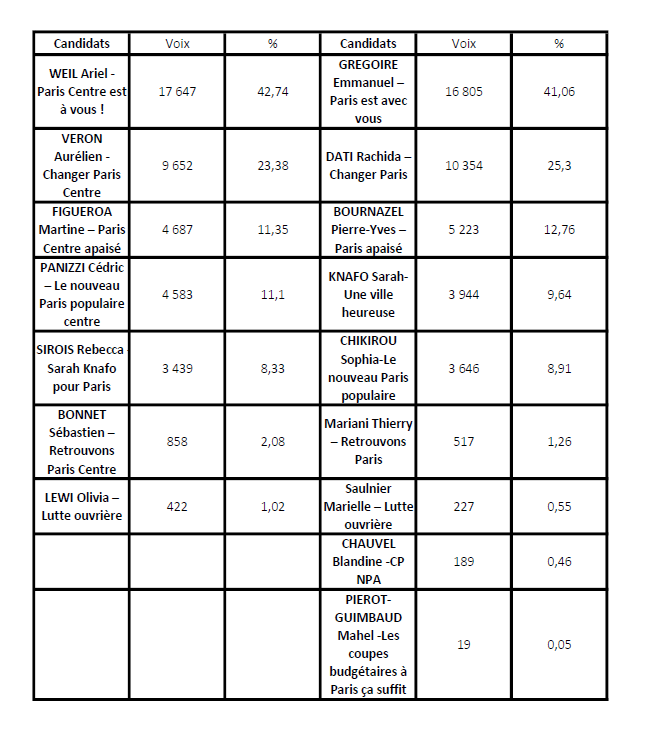 Résultats du 1er tour des élections municipales à Paris Centre
