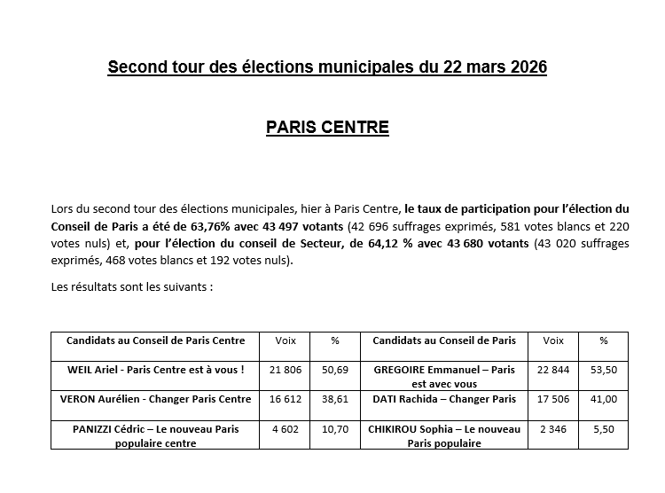 Second tour des élections municipales à Paris Centre Actualité Mise à jour le 24/03/2026 Découvrez la synthèse des résultats des élections du 22 mars 2026 à Paris Centre Crédit photo : Mairie de Paris