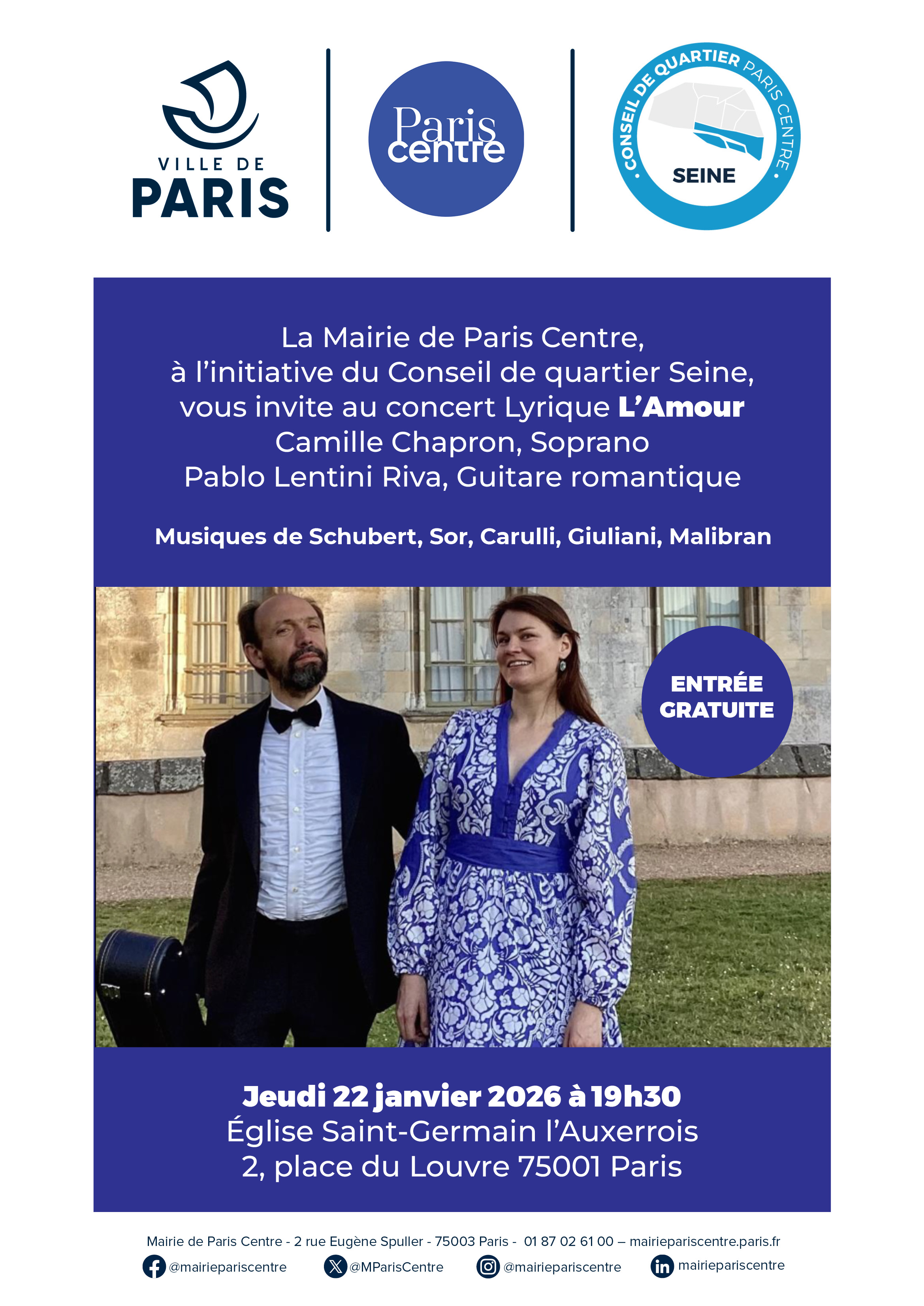 Organisé par le Conseil de quartier Seine, le concert lyrique retrace un programme passionnant entre la France, l'Italie, l'Espagne et l'Autriche à l'âge d'or de la guitare. Le fil conducteur de ce concert est l'amour, célébré dans les paroles de musiques des compositeurs Schubert, Sor, Caralli, Giuliani et Malibran.